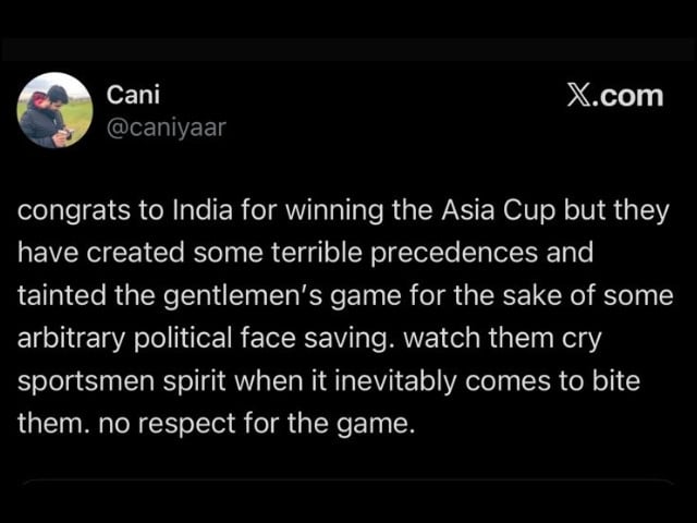 One user deemed his statement as ‘tone deaf’ while another criticised him for bringing politics into the gentleman’s game. “Congratulations to India for winning the Asia Cup but they have created some terrible precedences and tainted the gentleman’s ’s game for the sake of some arbitrary political face saving,” they wrote. “Watch them cry sportsmen spirit when it inevidently comes to bite them. No respect for the game.”